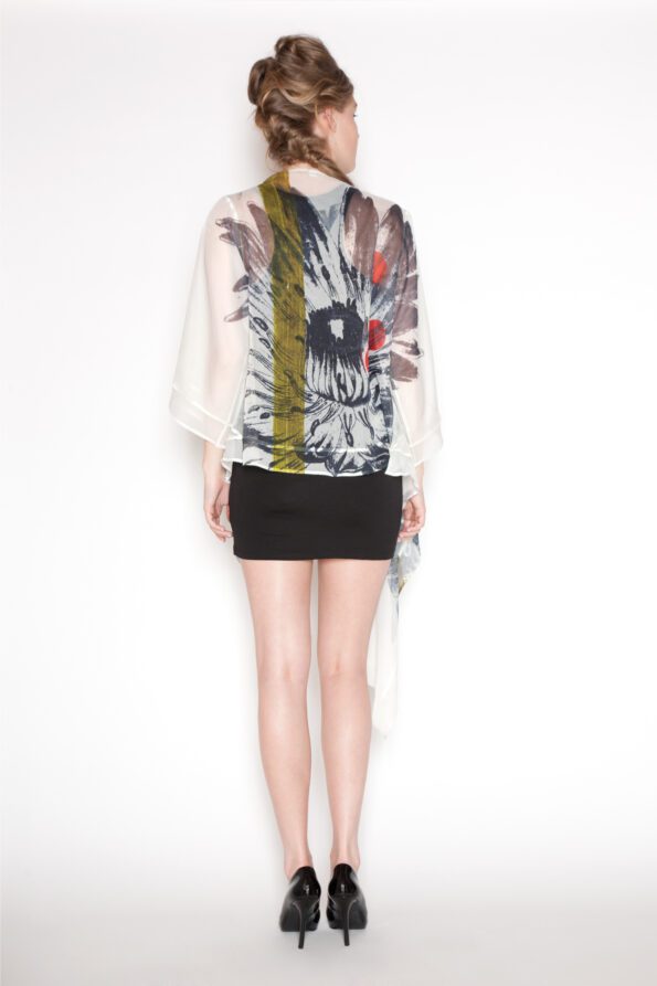The lotus image is screened onto a paper canvas of a dried painted line of ‘tarragon’ and dots of ‘heart’. The kimono is laid flat on the canvas and wrapped like origami. Pinned in place, an inverse painting of the lotus on ‘coal’ (like its reflection in the water) is pinned onto the front. The ‘sandwich’ is heat-set and when unfolded, the kimono reveals the lotus’s story; the darkness from which it grows, the stem that rises through the water, the seeds of life which shine within it and the flower rising to blossom, its petals migrating into the sleeves like rays of sun.